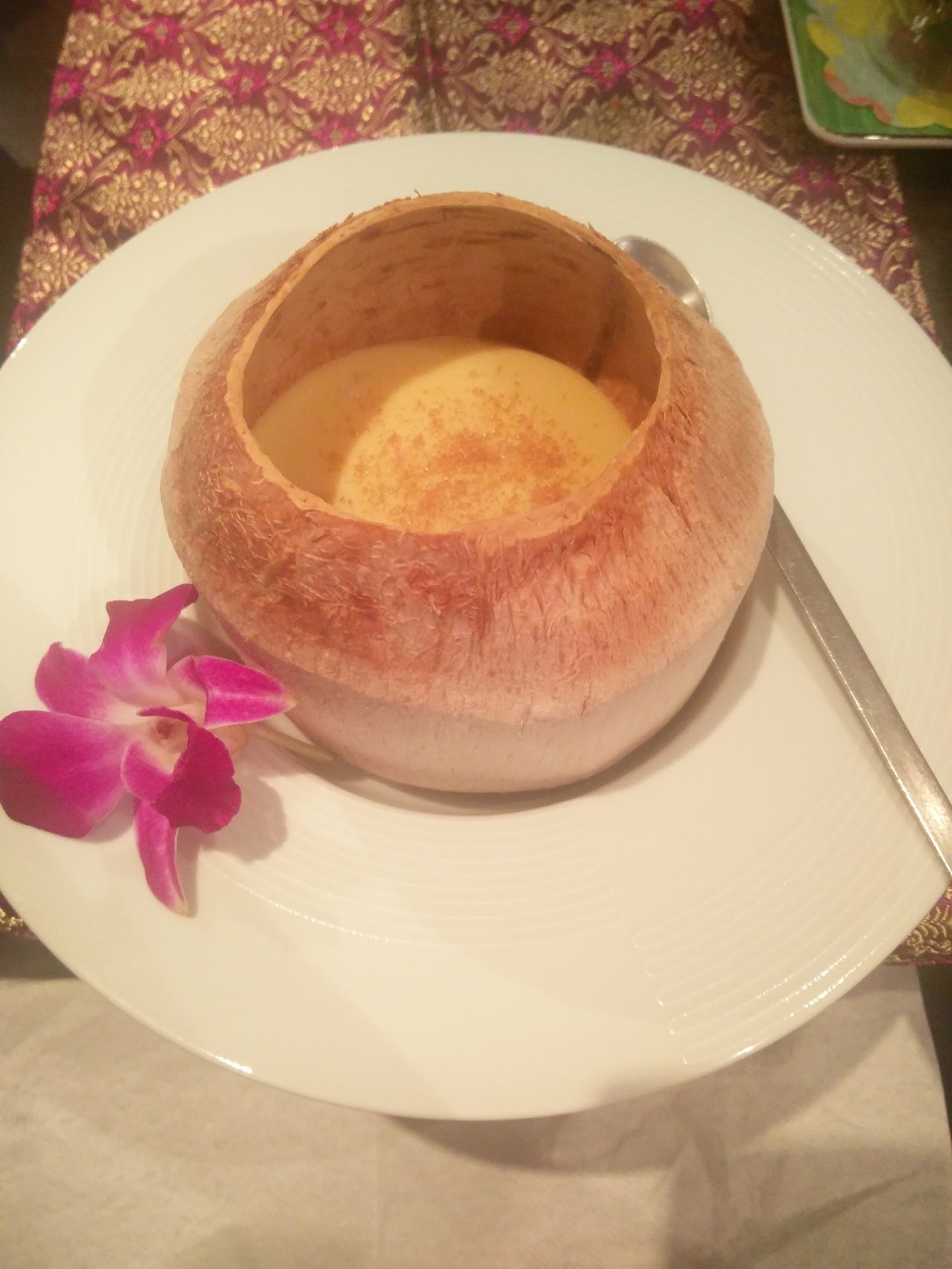 Als Nachtisch hatte ich die Kokuscreme mit karameliaierter Kruste in einer frischen Kokusnus 7,9€... Fail... die Karamellkruste fiel aus, weil es keinen Brenner gibt. Das hätte man bei der Bestellung sagen muss, so wurde einfach nur Zucker darüber gestreut. Habe ich wenig Verständnis für. Geachmacklich ganz ok 3*