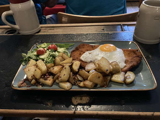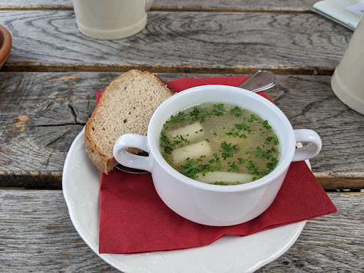 Having just arrived in Tangermünde, we stumbled across this location. There are a few tables outside so we sat there in the sun! Right next to a small park with a fountain (great for kids to run around), it was perfect to relax and take in the cuteness of the buildings around us. We ordered the Hochzeitssuppe, the potatoes with a sour cream dip and salad and the "pancakes" from the children's menu. The food took a long time but our waitress told us that there was a delay on the food in advance so we knew that to start with. We weren't in a rush so that was fine. Everything tasted super delicious, we will eat here again before we leave. The reason for the 4 stars is because when we arrived, we sat down at a table that had just become free. There were still the glasses on it from the previous customers (no problem at all, we decided to grab the table before someone else did) but as the waitress cleared those glasses, she didn't wipe the table. We were there with our daughter and kids just touch everything. Maybe the waitress was a bit overwhelmed because of the delay in the kitchen or whatever (it can happen that she just forgot) but i think it's important for the table to be wiped...
