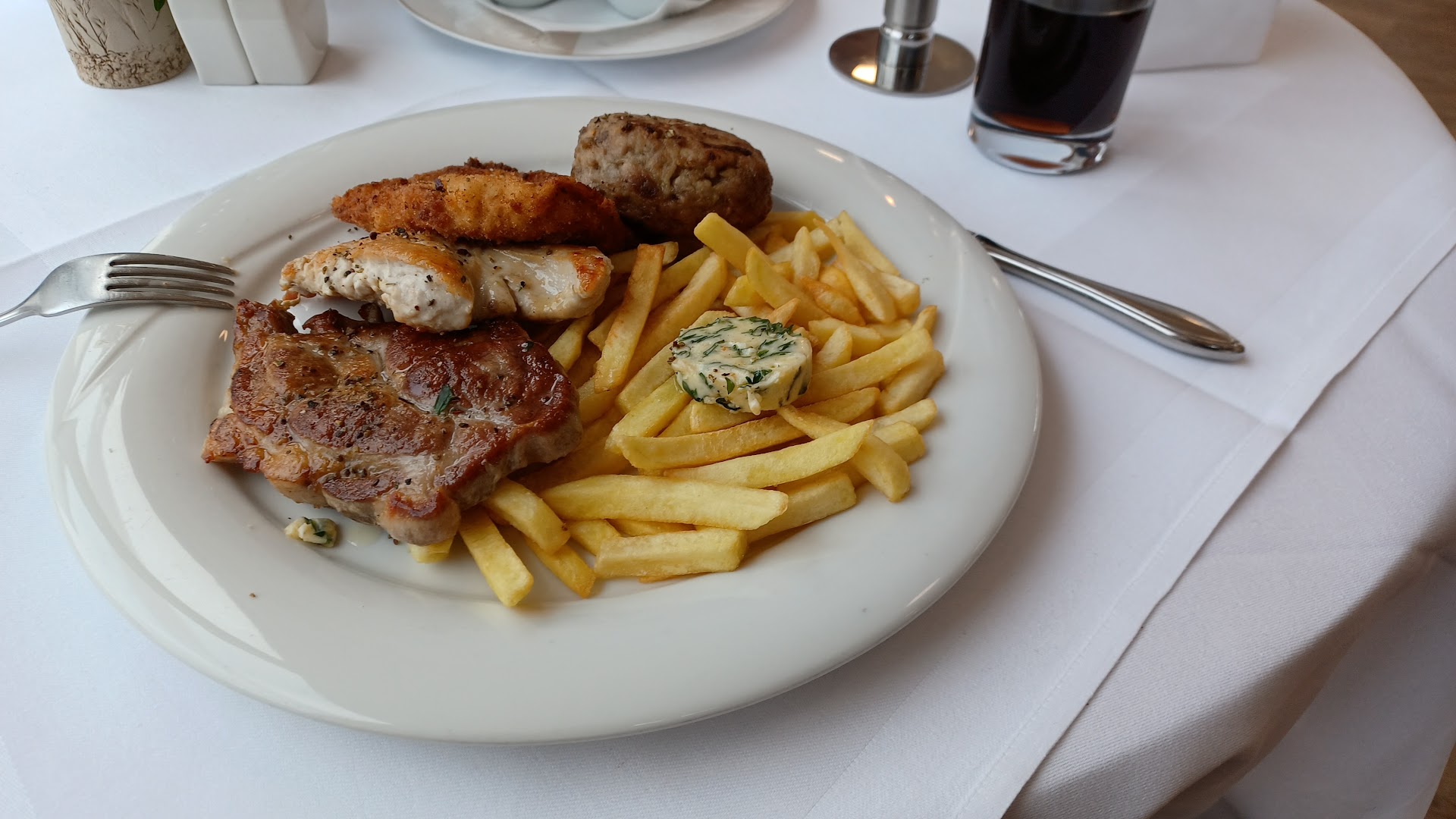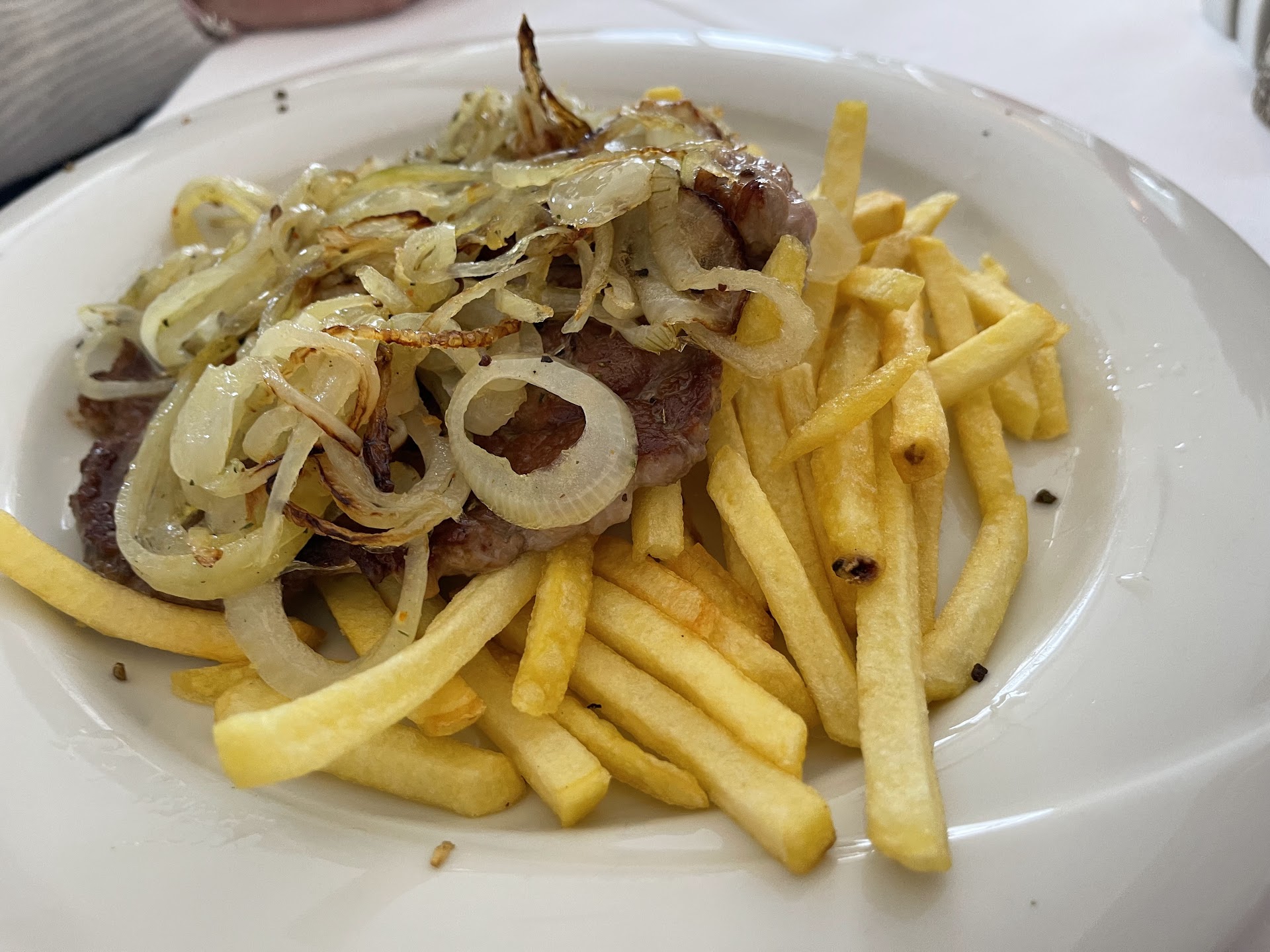 Leider bleibt mir diese Lokalität in keiner guten Erinnerung. Meine Pommes sahen nicht frisch aus, schmeckten sehr unangenehm und rochen auch... ich vermute, dass sie in altem Frittieröl gebacken wurden. Nach Beanstandung erhielt ich frische...das sah man sofort... Mittagessen Schnitzel mit Pommes 9.90€... wollte gerne Gemüse dazu...also aus der üblichen Karte Schnitzel, Pommes, Gemüse mit Sauce Hollandaise für 16.90€...Gemüseportion war sehr klein und deutlich ein TK Produkt aus der großen Tüte... Mayo musste zusätzlich bestellt werden, kleine Tüte je 50 ct...kein Hinweis vorab dazu... Mein Kind hatte Nudeln...Mit großen Zwiebelringen in der Sahnesosse...noch nie so gesehen, aber ok... Als ich- einem der besser deutsch sprechenden- Kellner mitteilte, dass dort ein langes dunkles Haar um ein Hähnchenstück gewickelt aus dem Essen holte, reagierte er kaum und nahm lediglich das Haar mit... Keine Entschuldigung, keine Info wie damit nun umgegangen wird... Letztendlich sah ich auf der Rechnung, dass wir die Nudeln nicht zahlen brauchten... ein Weiteressen der Nudeln war dann auch nicht mehr möglich... Mein Fazit, war vor 2-3 Jahren auch schon unzufrieden...hier gehe ich...