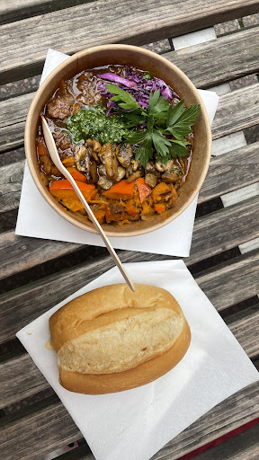 Auf dem Wochenmarkt in der Schillerstraße hatte ich zuletzt den "Kartoffelsalat" (1,50 €) ohne Speck dafür mit Dill und Schnittlauch probiert, allerdings war dieser für mich ein wenig zu trocken. Der "Rote-Beete Salat" (1,50 €) wäre an sich ganz gut, allerdings waren die großgeschnittenen Zwiebeln viel zu dominant. Ähnlich auch beim "Bohnensalat" (1,50 €) nur nicht ganz so extrem.