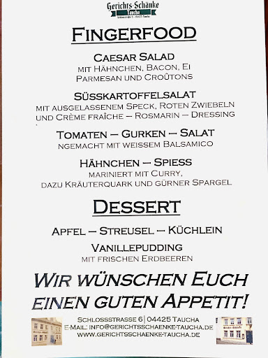 Read moreDie Gerichts-Schänke in Taucha liegt inmitten der Ortschaft. Gegründet in der 2. Hälfte des 19. Jahrhunderts wurde das Lokal für verschiedene Zwecke genutzt. Seit einiger Zeit wieder als Restaurant. Gediegenes Ambiente und gepflegte Gastronomie erwarten den Gast. Es ist nicht gerade für Sparfüchse geeignet. Was man aber für sein Geld bekommt ist es jedenfalls wert. So hatte ich z.B. einen auf der Haut gebratenen Zander, der auf den Punkt genau gegart war mit Sahne-Sauerkraut und Kartoffeln. Die Nachspeise Eis mit Schlagsahne Haube war auch ein Gedicht. Auch die Speisen meiner Frau (Kalbs Ossobuko) und ihrer Mutter (Wiener Schnitzel) waren laut deren Auskunft vorzüglich. Die Bedienung, wahrscheinlich der Chef persönlich bot einen hervorragenden Service. Wir können das Restaurant empfehlen und werden bestimmt auch einmal dort...