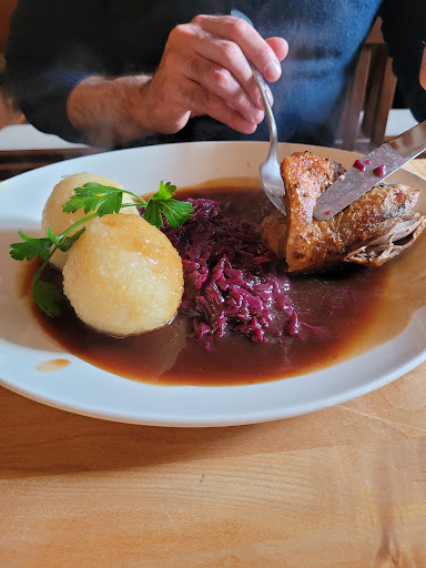 We ate here and as it was Wild Woche I had a Wild Board Schnitzel with a crusted almond crumb, cranberry sauce and fried potatoes, Loz had the standard schnitzel, both were excellent! The beers were also really good, I think I tried at least three, including Hefe-Weisse (Loz had this) Helles, Pilsner. It was a smaller restaurant than expected and a little quiet. Service was swift and the food choice was very good as was the pricing. I liked this place and can well imagine another night stayover here some time, it might be nice to come during the summer...