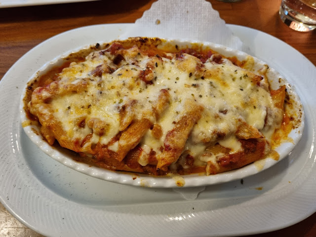 Die Penne al forno können wir jedoch nicht empfehlen. Auf der Karte wird bereits erwähnt, dass dieses Gericht Gemüse enthält, was ja schon mal gut zu wissen ist. Allerdings waren bei uns beiden, die wir das gleiche Gericht hatten, alle enthaltenen Gemüsesorten (Möhren, Paprika und Aubergine) noch fast roh. Da scheint einfach das rohe Gemüse mit in die Auflaufform gefüllt worden zu sein. Die Zeit im Ofen reicht dann aber einfach nicht, damit das Gemüse eine gute Konsistenz erhält. Das war so leider nicht lecker.