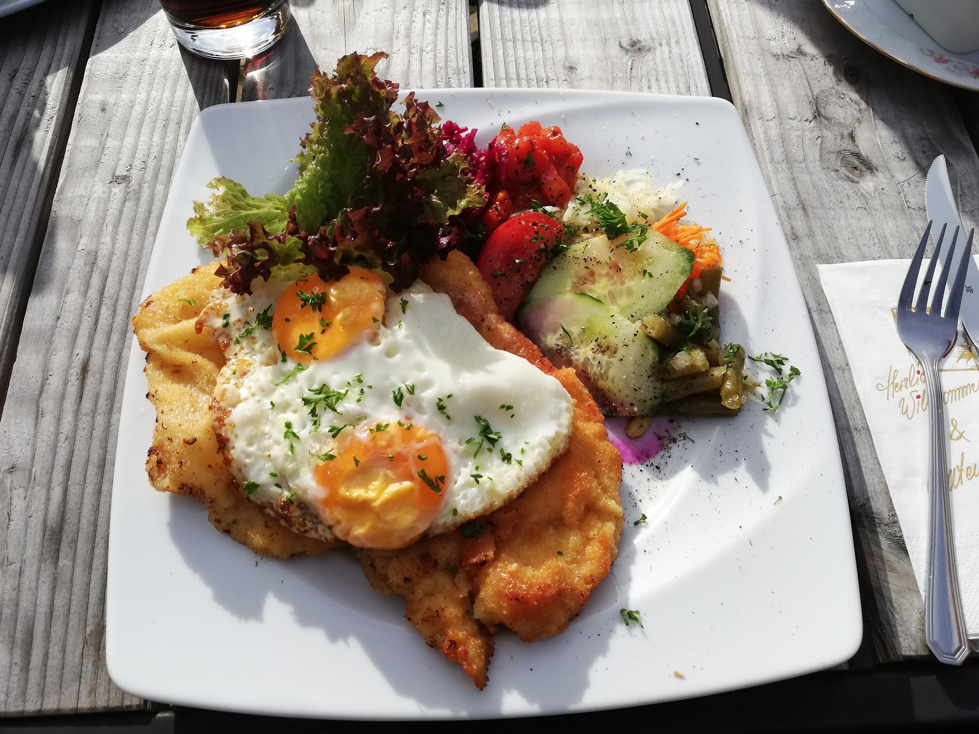 Wir hatten Forelle und Schnitzel mit Pfifferlingen. Das Essen war sooo gut, daß wir am nächsten Abend wieder hingefahren sind. Da gab es dann Burger mit Pommes, was auch wieder großartig war.