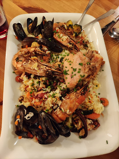 Unsere Paella war übrigens toll zubereitet mit perfekt gegartem Tintenfisch, Muscheln und Riesengarnelen. Vorher gab es ein leckeres Carpaccio. Den Abschluss bildeten zweierlei Schokomousse. Es war uns ein Genuss....