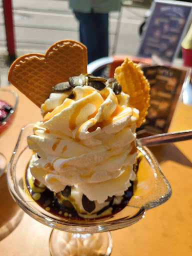 Read moreAm Samstag, 3.6.23 wurden wir von der jungen Bedienung sehr unhöflich angegangen. Mein "Vergehen" war, im Gastraum für meine Familie um eine Speisekarte zu bitten. Wir hatten schon eine ganze Weile draußen gesessen und wollten einfach nur schon mal eine Auswahl treffen können. Eine Karte wurde uns vom freundlichen Herrn auch gegeben. Das passte der jungen Dame aber gar nicht. Kurz danach rauschte die Dame an unseren Tisch und herrschte uns in einem unpassenden Ton an, wir sollten gefälligst ruhig bleiben. Darum baten wir sie dann allerdings auch. Uns verging der Appetit auf das möglicherweise leckere Eis. Und so sind wir dann lieber wieder gegangen, ohne etwas zu bestellen. Update 6.6.23: Mit der Bewertung wird keinesfalls das Café an sich, die Qualität der Speisen und der Service insgesamt bemängelt. Vielleicht ergibt sich in der Zukunft eine Möglichkeit eines erneuten Besuchs und dann können wir positive Erfahrungen machen, wie sie andere Gäste in ihren Rezensionen...