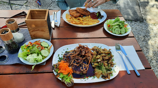 immer wieder kommen wir auf unseren diversen radeltouren beim alex vorbei. meist nur auf ein oder zwei bier. diesmal auch mit essen. wir bestellen schnitzel mit pommes von der mittagskarte für unter 10 €. es waren 2 stück schnitzel und pommes dazu. vollkommen ausreichend beim radfahren und echt noch günstig. schnitzen war qualitativ sehr gut. super natürlich das löwenbräu bier vom fass. dazu ein überaus netter wirt, was will man mehr. wirtshaus wie es füher normal war, heute muss man solche häuser suchen. biergarten zwar an der strasse, aber lärmmässig kein problem. wir kommen...