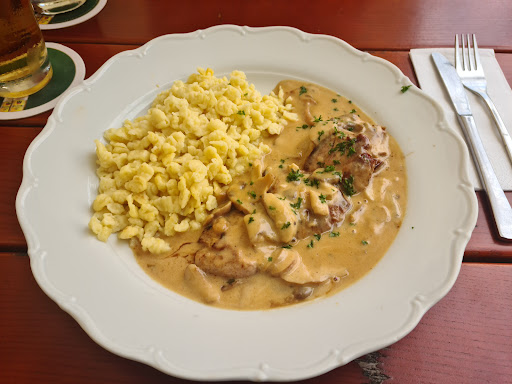 Die Getränke kamen schnell, das erste Essen, Pfefferlendchen, auch. Die nächsten 4 Essen, jeweils Braten mit Knödel, servierte man, als ich mit den Pfefferlendchen gerade fertig war. Nach insgesamt einer Stunde!!!, als wir alle schon aufgegessen hatten und die Bedienung abräumen wollte, fragte meine Schwägerin, ob man ihre Spaghetti-Burrata vergessen hätte!?! Man wollte nachfragen gehen und brachte sie dann auch prompt! - Na, geht doch ...! ... Aber leider viel zu spät!