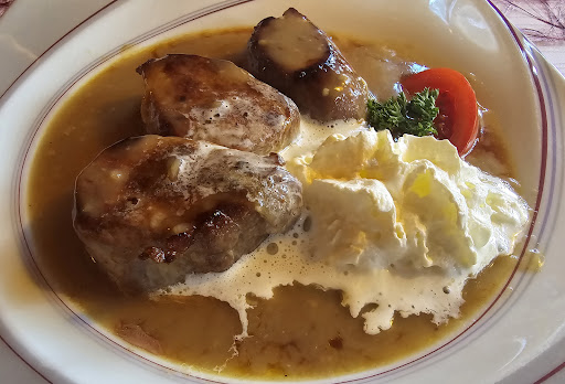 2 Sterne für den Salat, die Beilage (Pommes) und die Tatsache, dass die Preise, sofern das Essen an anderen Tagen nicht wie oben bei den Gästen ankommt, wohl...