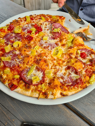 €3,90 for a plain plate of nacho chips (half a bag you could buy at a supermarket for half that). Then another €2,50 for some chemical cheese dip; unopened plastic container. The pizza, ~€12 is probably store bought deep freeze, baked in an oven for you. All in al, including drinks, roughly €50 spent on stuff you buy in a store for €15. You have to pick it up yourself from the window. Do not recommend, too much money for a dining experience I can do better with...