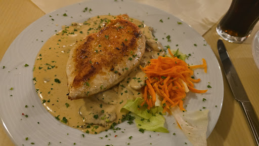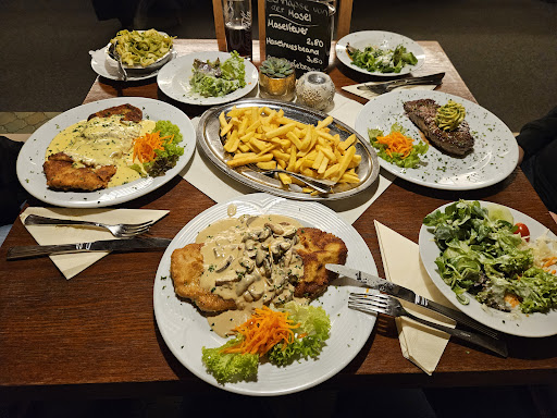Read moreWer gerade mehrere Bäume gefällt hat und einen Riesenhunger verspürt, ist hier genau richtig. Üppiger, knackiger Salat vorweg und dann dieses Riesenschnitzel, mit fantastisch abgeschmeckter Soße. Vermisst haben wir Bratkartoffeln. Es gab Kroketten. Am Vortag hatten wir telefonisch einen Platz reserviert, drinnen oder draußen wollten wir von dem Wetter abhängig machen. Ein Platz innerhalb der Gaststube wurde fix gemacht, aber wir könnten erstmal draußen schauen, ob's gefällt. Super Angebot. Der Durchgangsplatz an der Theke gefiel uns gar nicht, also draußen. Das Wetter war zudem prächtig. Nur- diesen Platz durften wir nur für 1,5 Stunden nutzen, danach war er reserviert. (??) Wir sind in Reil, um dem Massentourismus zu entgehen. Aber genau hier hatten wir den Eindruck. Und schließlich bieten andere Lokale in Reil ein wesentlich besseres Ambiente. Gerade auch von dem "Biergarten" hatten wir mehr erwartet. Aber wie gesagt: wenn man gerade Bäume...