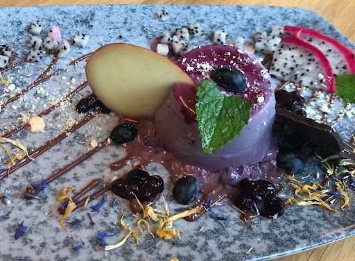 Sämtliche Gerichte, die unserer kleinen Gruppe serviert wurden, waren ausnahmslos nicht nur geschmacklich wirklich ganz hervorragend, sondern auch die Darreichung war mehr als einladend. Dabei konnten die "eigenen Augen selbst vom den Tellern der Tisch-Nachbarn mitessen". Geschmacklich war das Essen, vor Allem auch die Desserts durchgängig ein derart tolles Erlebnis, das uns trotz unserer bisher sehr häufigen kulinarischen Ausflüge noch nicht sehr oft gegönnt war. Insbesondere für seine ajuwedischen Gerichte verdient der junge Koch ein ganz besonderes Lob.