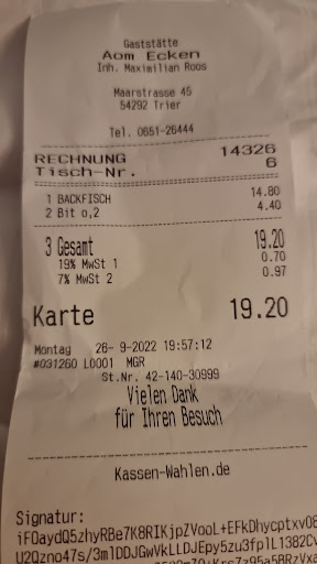 Read moreMeine Frau und ich waren für eine Woche in Trier und wohnten in der Nähe vom Aom Ecken.Auf Grund der guten Bewertungen mussten wir das Lokal natürlich aufsuchen.Und wir wurden nicht enttäuscht!Eines der besten Lokale die wir in den letzten Jahren in ganz Deutschland besucht haben-und das waren so einige .Hier stimmt alles:Von den freundlichen Bedienungen,über die leckeren Gerichte,Preis-Leistungsverhältnis und Gemütlichkeit.Man kann aber auch nur etwas trinken-z.B.Viez-und mit den Einheimischen ins Gespräch kommen.Man sollte allerdings reservieren.Unangemeldet braucht man etwas Glück um einen Platz an einem Tisch zu bekommen. Von außen unscheinbar,aber...