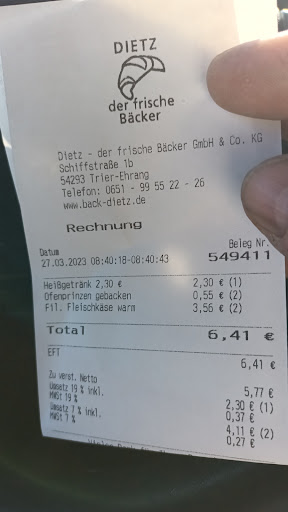 Read moreAls Fahrer war ich öfter mal in der Filiale, allerdings wenn man ein Kochschinken Brötchen, welches schon saftige 2,20 Euro kostet, ein Körner Fleischwurstbrötchen eingepackt bekommt und fette 3,15 Euro zahlt, is das schon heftig, da gehen quasi gleich mal 30 Minuten Stundenlohn auf son Brötchen drauf, da bekommt man in anderen Bäckereien ein 2 Pfünder Leib Brot. Junge, Junge, dann lieber Hungern. Ansonsten ist die Filiale ja ganz schön gestaltet... vielleicht is der Kaffee auch ganz nett, wenn man es dort verzehrt, aber die nehmen es schon von den Lebendigen... Wo doch der Preis fürs Mehl runter gegangen ist... Da lob ich mir doch glatt die Bäckerei in...