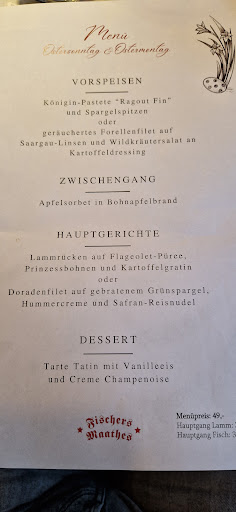 Read moreWir waren zu viert zu einem Kurztrip über Ostern in Trier. Am Ostersonntag hatten wir einen Tisch in Fischers Maathes reserviert. Bedingt durch die Feiertage gab es dort ein vier Gänge Menü. Zuerst haben wir etwas überlegt, ob auch jeder Geschmack getroffen wird, dann haben wir aber die Reservierung aufrechterhalten. Zum Glück! Im Vorfeld haben wir schon kurz dort reingeschaut und gefragt, ob es ein Problem ist, unseren Hund mitzunehmen. Dies wurde aber verneint, mir wurde sogar gesagt, dass Sie sich freuen, das ich überhaupt nachgefragt hatte. Jetzt zum Essen: gestartet haben wir mit einem von der Chefin empfohlenen Sekt.... der war schonmal sehr gut und dann kam das Essen. Da wir zu viert waren, hatten wir auch alle Varianten des Menüs. Es war schonmal sehr schön und ansprechend angerichtet. Geschmacklich war alles hervorragend. Und das sagten wir alle. Die Lammrücken Medaillons waren rosa gebraten. Der Service war flott und freundlich und aufmerksam. Das Preis/Leistungsverhältnis passt. Wenn überhaupt eine Kleinigkeit von mir zu kritisieren wäre, dann das es mir etwas zu schnell mit den verschiedenen Gängen ging, hier hättet ihr euch etwas mehr Zeit lassen können. Da wir keine Weintrinker sind, haben wir uns füreinander Bier entschieden. Es was ein Bitburger, im Tonkrug und ganz anders als ich es erwartet hätte. Sehr süffig, malzig, auch rundum lecker. Sollten wir wiedermal nach Trier kommen, werden wir hier ganz bestimmt...