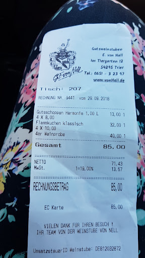 Read moreVorab....wunderbare Weinprobe. Nur zu empfehlen. Wir wurden mit einem tollen, älteren Bus durch einen Teil der Stadt gefahren, mit Informationen zur Stadt. Dann ging es zu einem Aussichtspunkt. Dort konnten wir von oben noch einen Blick auf Trier werfen. Und dann ging es zum Weingut. Herr Nell ist ein sehr freundlicher, offener und lustiger Mensch. Man hat sich sofort gut aufgehoben gefühlt und er verstand es auch die Kommunikation untereinander in der kleinen Gruppe zu animieren. Die Weine waren sehr gut. Der Weinkeller - ein Traum. Das war wirklich sehr schön zu sehen. Wir haben viele interessante Informationen erhalten. Dann ging es in die Stube - wunderschön. Sehr gemütlich. Unsere kleine Gruppe setzte sich zusammen an einen der großen Tische und wir unterhielten uns alle sehr gut zusammen und wer möchte kann dann schon von Herr Nell zurück zum Ausgangspunkt gebracht werden oder sich noch etwas schmackhaftes von der Karte bestellen bzw. auch direkt leckeren Wein erwerben. Preislich alles sehr gut. Wir haben uns sehr gut aufgehoben gefühlt. Es war wirklich sehr schön. Vielen lieben Dank für dieses schöne Erlebnis als Abschluss von unserem kleinen Moselurlaub. Wir sind wirklich sehr glücklich über diese so...