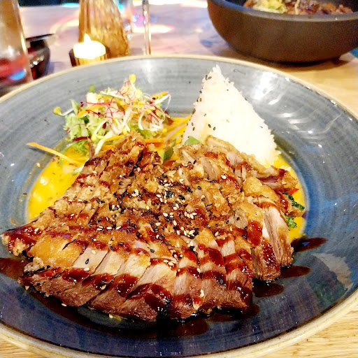 Der Service war extrem freundlich und zuvorkommend, dass Ambiente schön, und das Essen war auch gut...aber eben auch nur gut. Die Vorspeisen "Mixed Tapasplatte" war schmackhaft und gut angerichtet...jedoch...was mich hier wirklich gestört hat und wo ich mir von so einem Restaurant mehr erwartet hätte war, dass die dazugereichten Soßen komplett aus der Flasche waren. Ich hätte mir wenigstens eine einzige schöne, pikante, selbstgemachte asiatische Soße gewünscht, in die wir unsere Tapas hinein hätten dippen können, anstelle der klebrigen und typischen Fertigsoßen, die man aus allen asiatischen Bereichen kennt. Allerdings kennt man auch Gastronomien aus dem asiatischen Bereich, die sich die Mühe machen und aus Gojijangpasste, Sojasoße, Knoblauch, Essig, Sesamöl Zucker und Chili eine sehr köstliche Soße selber herstellen!
