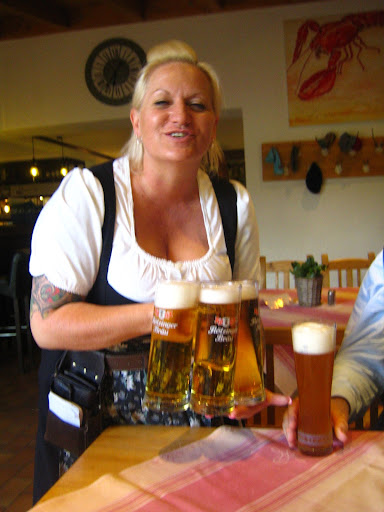 Aber der Reihe nach. Den ersten Eindruck machte unsere Bedienung. Meine Mama meinte, dass man früher, um das Dekolete beim Tragen eines Dirndls besonder fesch wirken zu lassen, Blumen hineinsteckte. Die heutige Bedingungen hatte sich stattdessen das ganze Dekolete mit Blumen tätowieren lassen. Schön fanden wir es nicht, aber dafür selten. Aber über Geschmack kann man streiten. Neben recht groben und derben Sprüchen, für die sie sich schon immer viel Zeit nahm, musste man teilweise 20 Minuten auf ein Getränk oder Brot warten. Ob die Zwiebeln in Schmalz rausgebraten waren oder mehr darin gekocht, war nicht ganz zu erkennen. Jedenfalls waren keine Röstaromen zu erschmecken, sondern es fühlte sich an, als ob man auf einem Schmalztopf herumkauen würde. Zum Obatzen gab es auch keine Brezen, sondern Brot. Das restliche Essen war jedoch in Ordnung, wenn auch kulinarisch nicht besonders ausgereift. Bei einem früheren Besuch schmeckte der Schweinebraten leider ziemlich verkocht.