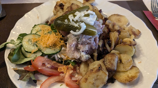 Read moreIch hatte mich sehr auf Thüringer Klöße gefreut...diese gibt es mit Lamm-, Gänsebrust-, Kaninchen-, Entenkeule und Rindsroulade und Rotkohl für ca.. 16,80 €. Ich hatte Rindsroulade, Rotkraut und Klöße...solch komischen Klöße hab ich noch nie gegessen, matschig, grau und KEINE Semmelbrösel. Nicht einmal ansatzweise Thüringer Klöse. Schade! Entweder den Koch wechseln oder er soll sich ein Rezept aus dem Dorf holen. Rotkraut 2 Esslöffel voll auf dem Teller 😔 Rindsroulade ging so und war auch heiß. Mein Mann Schnitzel mit Pommes. Pommes gut, Schnitzel sehnig. Bier Saalfelder und Chemnitzer...beide Biere sehr gut. Nächstens lieber Bier trinken statt essen. Klöße waren echt schlecht! Bedienung ist halt vom Dorf, komm ich nicht heute, komm ich morgen, aber nett. Sitzgelegenheiten reichlich, draußen, drinnen oder wer einen Saal braucht? Alles da! Toilette komplett raus und Richting Saal laufen, dann die Tür rechts. Parkplätze davor, ca. 7 Autos passen davor. Für die Qualität und den Preis, kann man auch woanders hin gehen. War über das Essen...