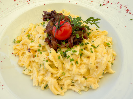 Käsespätzle is made from soft egg noodles (Spätzle) and cheese—typically Emmentaler or other mountain cheese. The hot noodles are mixed with grated cheese until melted, then finished in the oven, and topped with crispy fried onions.