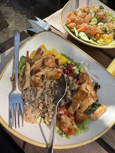 avocado & salmon bowl 8/10 crunchy chicken bowl 7.5/10 all the veggies, sliced fruits are feesh and compliment each other when mixed. but i feel the chicken can be improved - its a bit dry ( for my preference)