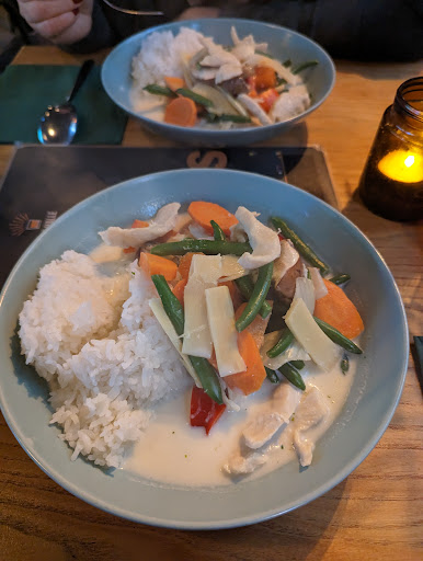 Absolutely recommendable: Chicken with cocos sauce, vegetables and rice at the asian food stand.