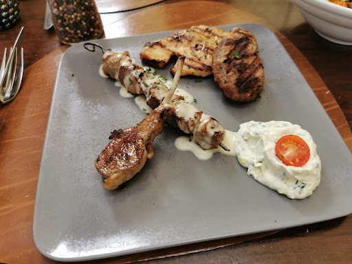 Die Hauptgerichte zeigten das gewollte (leider nicht erreichte) gehobene Niveau auch weiter. Es war schön angerichtet aber von der Größe eher eine Vorspeise. Meine 2 Fleischspieße waren zwar klein aber von guter Qualität ich machte nur den Fehler und tunkte mein Fleisch in die Soße, das war nach einstimmige Meinung aller (diese Soße befand sich auf 3 unterschiedlichen Gerichten) purer Zitronensaft. Bei den Fleischspießen nannte sie sich auf der Karte Zitronen-Olinenöl-Vinaigrette, bei dem einzigen Vegetarischen Gericht und dem Mix-Grillteller war sie gar nicht angegeben aber trotzdem reichlich vorhanden. Alle 8 Personen am Tisch waren der Meinung der Zitronengeschmack ist extremst zu heftig.
