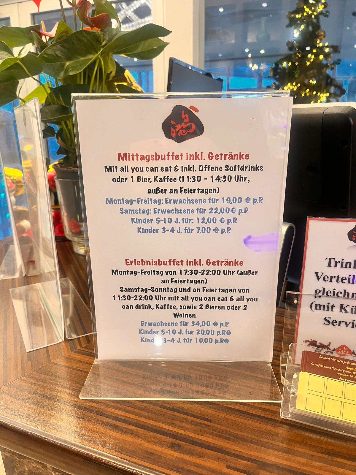 Seien Sie vorsichtig, wenn Sie zum Mittagsbuffet gehen (11:30 bis 14:30)! Es gibt mittags einen großen Preisunterschied zwischen Mittagsbuffet ohne Grill (22 Eur) und "Erlebnisbuffet" mit Grill (34 Eur). 22 Euro sind eigentlich ein gutes Preis-Leistungs-Verhältnis, aber 34 Euro sind meiner Meinung nach zu viel. Aus dem Schild, das für das Mittagsbuffet (an der Rezeption) warb, entnahm ich, dass das Mittagsbuffet 22 Euro pro Erwachsener kostet, einschließlich eines Biers oder unbegrenzter Softdrinks. Am Ende stellte sich heraus, dass ich 34 Euro pro Person zahlen musste, da ich auch vom Grill genommen hatte. Niemand hat uns das am Anfang erklärt und dies ist das erste Mal, dass wir dieses Mittagsformat genutzt haben (normalerweise gehen wir abends), also waren wir sehr verärgert, als wir die Rechnung bekamen.