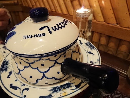 I went to this restaurant with a friend on a weekday in the evening. The restaurant was not crowded. We ordered the TOMJAMGUNG (soup), TOMKHAGUNG (soup) and THODMAN PLA (fish cake) as entrees and for our main course we ordered the PLA DUG PAD PHET (trout) and the PLAMUK PAD KIMAU (stir-fried squid). All dishes lacked flavour. Especially the soups lacked Thai herbs/spices. I didn't taste any galanga nor lime leaves nor lemongrass. Moreover the coconut milk in the TOMKHAGUNG was clotted. The soup didn't have that creamy consistency. Both soups are described as "hot and sour", but they were not spicy at all and only very mildly sour. The fish cake usually tastes really aromatic, because there should be lime leaves inside, but there weren't. The consistency was good though. As Chinese fish cake I'd say it was good, but it wasn't a Thai fish cake.