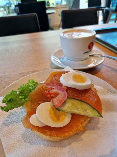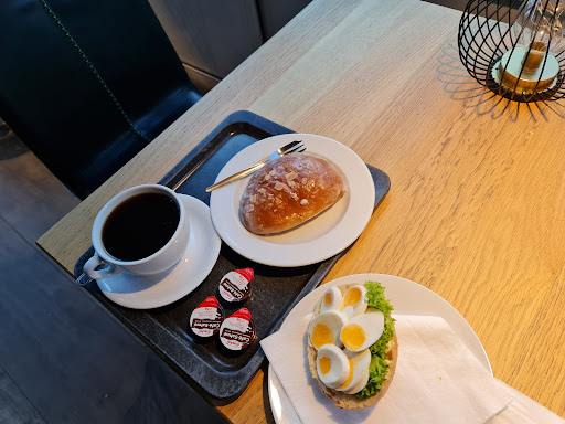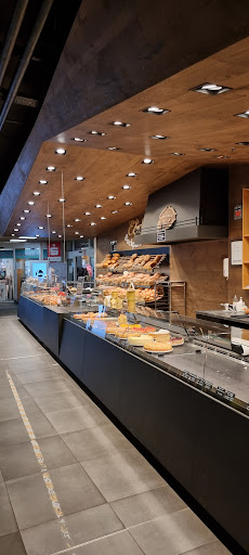 Nicely decorated and quite large bakery with ample sitting room and many tables. Probably one of the larger bakery/restaurants around this area. A long counter with selection of bread rolls and cakes. Coffee, hot drinks, juices and soda pops are also offered here. The sitting area has many tables, square, rectangular and circular made from real wood. A cosy coloured corner area near a replica fire place offers a deviation in style. High chairs and toys are also available here to help distract and occupy...