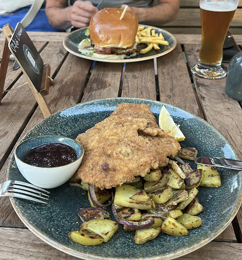 Zuerst muss ich sagen wir wohnen in Unterföhring und sind bisher noch nicht hier gewesen. Auch wenn das Wetter heute sehr toll ist und das Restaurant voll kann man bei den Preisen schon einen gewissen Service erwarten. Wir bekamen einen Tisch zu gewiesen und haben uns nach 20 Minuten selbstständig nach einer Karte erkundigt weil bisher uns keiner bedient hat. Meine Frau hat nudeln mit Fisch bestellt. Auf dem Foto kann man erkennen wie die Sauce unten auf dem Teller schwimmt. Die Nudeln haben katastrophal schlecht geschmeckt, Einzig allein der Fisch war gut da er auf dem Grill gemacht wurde. Meine Tochter hat Käsespätzle gegessen , die für 14,90 € angemessen geschmeckt haben. Da sie nicht alles geschafft hat hab ich den Rest gegessen. Auch wenn wir immer das Problem ist Genügend Personal zu bekommen, sollte man dann nicht die Gäste unnötig warten lassen und den Zugang beschränken. Es nützt niemand was Tische unnötig zu blockieren bedient zu werden, und nicht zahlen zu können. Atmosphäre ist super, auch wenn es direkt neben dem Biergarten ist, der sehr voll ist und wesentlich mehr Tische bräuchte. Auch beim zahlen wurde nicht gefragt ob es geschmeckt hat , obwohl der teller Halbvoll zurückging Alles in allem...