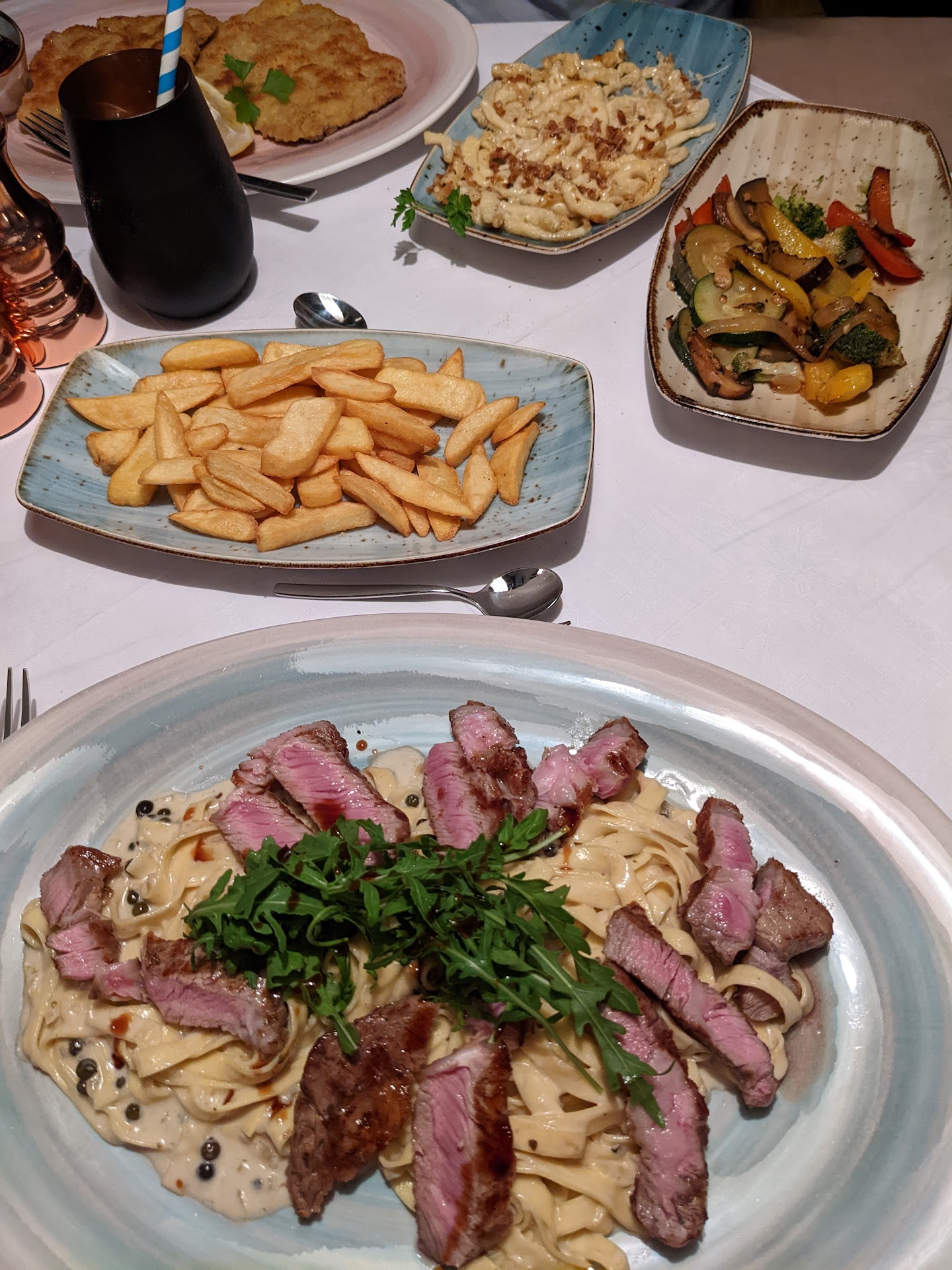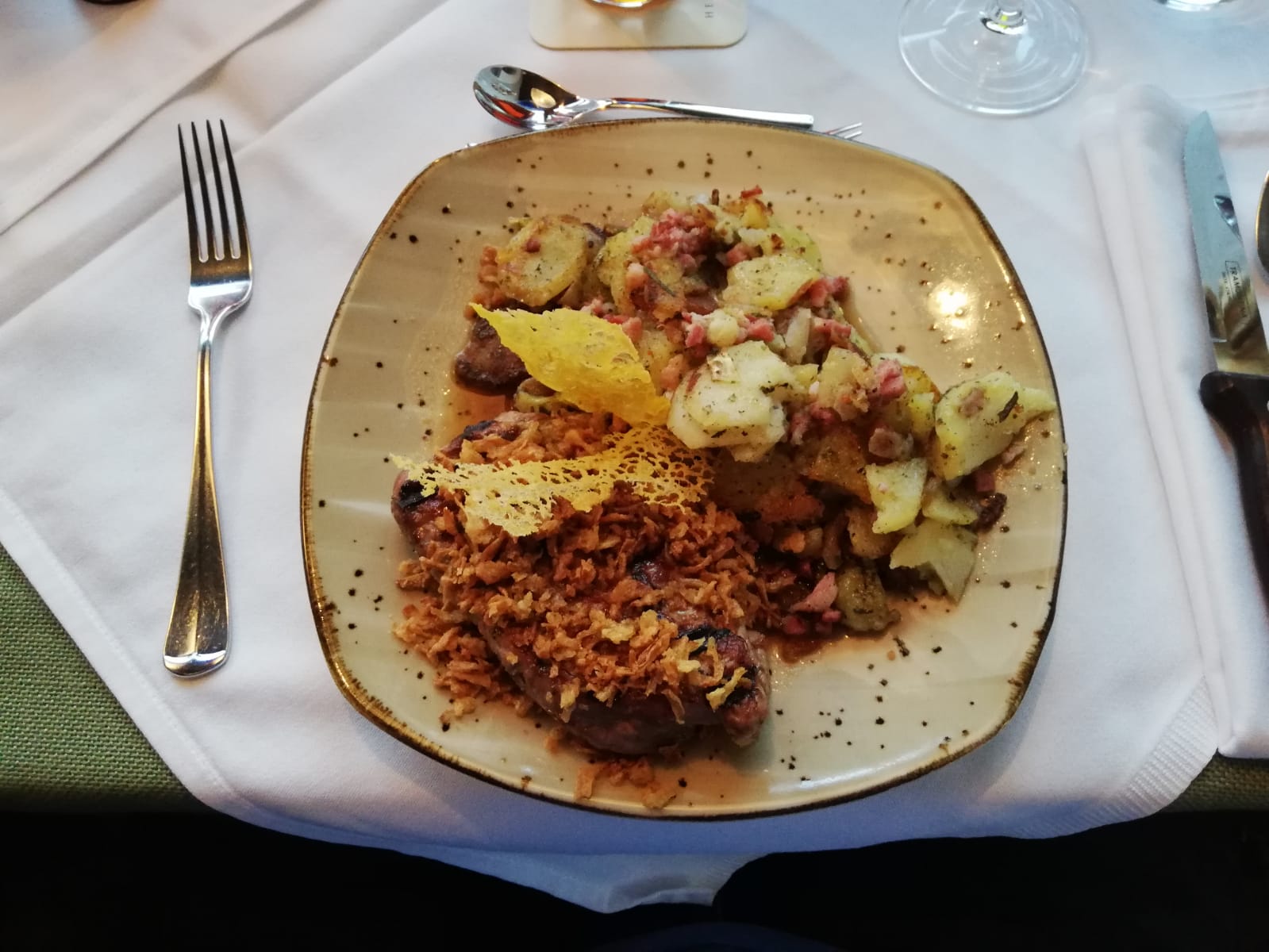 Das Essen war fantastisch. Das sage ich selten. Alle Zutaten waren frisch. Im Salat nicht die Spur eines welken Blatts. Knackig UND mit Geschmack, das Ganze angenehm zurückhaltend angemacht. Das Fleisch auf den Punkt zubereitet ohne viel Schnickschnack. Sehr gute Qualität (als Schlachterenkel darf ich das sagen). Die Nachspeise ebenfalls ein Gedicht. Gut abgestimmt, nicht nur einfach süß.