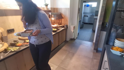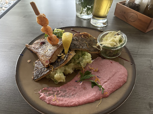 Food and service was excellent and well above what we had hoped for arriving just before closing time. The horseradish sauce & presentation took this from a 4 to a 5. Outdoor seating available, but as it was raining when there we sat inside. The atmosphere is kind of sterile, but good looking & the space also serves a great breakfast buffet in the morning.