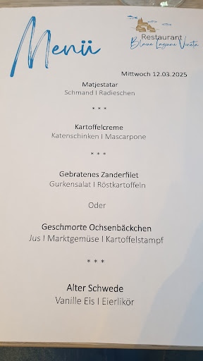 Leider wurden wir heute zum 2. Weihnachtsfeiertag sehr enttäuscht. Wir reservierten vor einiger Zeit einen Tisch in der blauen Lagune. Zu der Zeit hätte man uns bereits darauf hinweisen können, dass es an diesem Tag kein A la Carte Essen geben wird. Dies hat man aber nicht gemacht. Heute waren wir nun dort zum Essen und als wir dann am Tisch saßen, wurden wir vor vollendete Tatsachen gestellt. Es gibt nur Büfett, der Preis beträgt 27 Euro pro Person. Für den Preis, dachten wir zumindest, darf man ein gutes Büfett erwarten. Es beschränkte sich tatsächlich auf 2 Gerichte, welches Fisch und Ente war. Die Ente war so trocken, man hätte denken können, sie war vom Vortag, die Rosmarinkartoffeln waren geschmacklich leider nicht besser, vom Dessert können wir leider auch nichts anderes sagen. Rotkohl und Gemüse waren gut. Insgesamt sind wir dermaßen enttäuscht und haben für diesen Preis bedeutend mehr Qualität erwartet. Und das man zum guten Schluss nicht mit Bargeld bezahlen darf, zumal Bargeld in Deutschland ein gesetzliches Zahlungsmittel ist, ist schon...