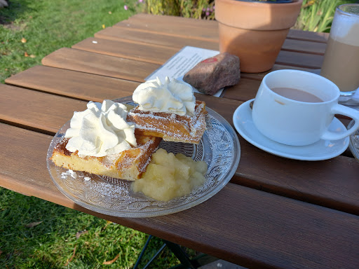 Read moreEin richtiges tolles Ambiente, wo man schön in der Sonne sitzen kann. Viel Platzwahl. Entweder Tisch mit Stühle oder Strandkorb. Lecker Waffel gibt es da und leckere heiße Getränke, aber auch ein kühles Bier oder einen Wein kann man dort genießen. Wir hatten zwei HeißGetränke und zweimal den Waffelapfeltraum für 17 Euro, kann man echt nicht meckern. Nettes und freundliches Personal. Aber ACHTUNG: Selbstbedienung ist hier oberstes Prinzip. Man kann auch selbstgemachtes Gelee oder Honig dort kaufen. Sollte man immer unterstützen (meine Meinung). Ein WC für Damen und Herren ist vorhanden und sauber. Man kann auch drinnen sitzen, dort befindet sich sogar ein kleines Kamin.