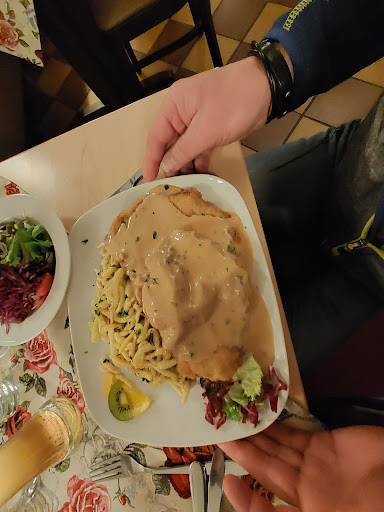 Es hat meinen Geschmack absolut nicht getroffen. Es begann beim Eintreten ins Restaurant. Das Ambiente etwas älter und wirkte irgendwie kühl und ungemütlich. Wir wurden allerdings freundlich begrüßt und in den ersten Stock geleitet, wo der Tisch für die große Gesellschaft reserviert war. Wir waren alleine oben, was somit sehr angenehm und ruhig war. Der Service war fix, schnell wurden Getränke aufgenommen und die Karte( zu Weihnachten eine abgespeckte Karte) wurde gebracht. Das Ambiente allerdings war auch oben ernüchternd kühl. Eine Bühne und ein Tresen sowie lange Tische aneinander. So wie in einem Sitzungssaal, Die Tischdekoration war spärlich. Nun zum Essen: Der gemischte Salat vorweg war eigentlich richtig gut. Aber: was sucht Kartoffelsalat darin? Völlig unpassend, zudem schmeckte man, dass dieser nicht selbstgemacht war. Bestellt hatten meine Frau und ich jeweils Schweinemedaillons mit Pommes. Sie mit Pfeffersauce, ich mit Champignonrahmsauce. Zunächst mal, die Portion Fleisch war üppig. Drei Medaillons. Meine waren okay, die meiner Frau noch zu roh, wobei es entweder kein richtiges Filet war oder schlechtes Fleisch. Die Pfeffersauce war eher eine salzige Sauce. Meine Champignonrahmsauce war auch nichts tolles, irgendwie was vom Großhandel. Die Pommes lieblos verteilt, möglicherweise um den Anschein zu erwecken, es sei eine große Portion. Das war es aber nicht, zudem waren die Pommes nicht wirklich toll oder knusprig, sie kühlen sehr schnell aus. Ach ja, Salz gab es am Tisch auch nicht. Eine Frage? Warum war dort Kiwi auf dem Teller??? Preise: Pro Portion Medaillons 17,90 €, das ist in Ordnung. Zusätzlich 2 Weizenbiere, 2 Radler, 1 Cola und ein schlecht schmeckender Cappucino haben den Gesamtpreis auf knapp 56€ summiert. Wir kommen allerdings nicht wieder. Preis-Leistung hat in diesem Fall...