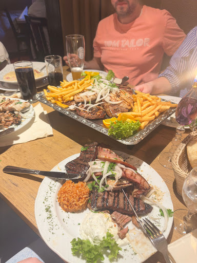 Das Restaurant war sehr voll, aber ist ja eigentlich ein gutes Zeichen. Die Akkustik war dennoch angenehm. Die Preise sind angepasst aufgrund der Portionen. Serviert wird vorweg ein Quzo oder Julischka und nach dem Essen ebenfalls. Tzaziki vorweg bestellt , der einfach Bombe ist. Vorweg ebenfalls zu fast jedem Gericht ein Krautsalat mit Tomate, olive und Peperoni. Der Salat ist sehr lecker vom Geschmack her und frisch. Das Hacksteak ( Kosaken Steak)welches ich mir bestellt habe, habe ich allerdings woanders schon besser gegessen. Es war zwar lecker vom Geschmack her, aber irgendwie kam es mir vor, als wenn es eingefroren war. Mann konnte die Konsistenz vom Rinderhack oder Lamm nicht erkennen. Es war so zusammen gepresst. Bei einem anderen Restaurant ist es fluffiger und der Käse zerläuft. Das war hier leider nicht der Fall. Die Brötchen die vorweg gereicht werden, sind frisch gebacken und schmecken auch sehr lecker zu dem leckerem Tzaziki. Gyros war auch bei uns serviert, der auch sehr gut schmeckte. Also richtiger Gyros. Verbesserung wäre auch an gebratenem Speck, der auf 3 Tellern nicht gebraten war, sondern ölig und irgendwie angeschmort wurde. . Es waren keine Röst- Aromen dran und nicht kross. Daher wurde es leider auf den Tellern liegen gelassen. Wir waren mit 8 Personen da. Viele hatten unterschiedliche Gerichte. Aber jedem schmeckte es. Preise sind halt teurer geworden, ebenso die Getränke wie überall. Den Wein fand ich auch übertrieben teuer, aber das ist gerade auch überall so. Aber er schmeckte gut. Hauptsache Fazit. Essen lecker, Bedienung ist mega nett, fragt zwischendurch ob alles in Ordnung sei, und zuvorkommend. Abrechnung erfolgte auch unkompliziert. Ich komme...