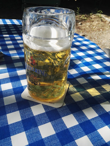 Read moreEin Biergarten nur einen Steinwurf vom Mainufer entfernt, das hat schon was. Bierzelt Garnituren und 4er bzw 6er Tische laden einen förmlich ein zum Verzehr. Platz gibt es also genug und das ganze liegt zu 85% im Schatten. Das Laubdach der Bäume 🌳 bietet einen angenehmen Schutz und verleit dem ganzen einen Hauch von einem gelungenen Urlaubstag. Die Tische soweit wir das beurteilen können, waren sauber, allerdings wurden sie nach Gebrauch auch nicht abgewischt oder gar desinfiziert, ein Manko wie wir meinen. Die übrige Garten Wirtschaft machte einen ordentlichen Eindruck. Achtung ⚠️ es herrscht Selbstbedienung, das heißt Platz suchen und einen auserkoren der die Getränke und die Speisen holt. Für allein Reisende Rollstuhlfahrer sehen wir das als problematisch an!! Da wir nur unsere durstigen Münder mit etwas flüssigen versorgen wollten, kamen wir nicht in den Genuss von den, wie wir fanden gut aussehenden & gut👍 riechenden Speisen, auch die dar gebotenen Kuchen sahen sehr verführerisch aus. Was unsere Getränke betrifft, die Flasche Mineralwasser war kalt und frisch 👌, jedoch beim Kaffee bemängeln wir, das er etwas zu dünnn war, nach unserem empfinden und Geschmack, es fehlte das Aroma. Die Toiletten waren bei unserem Besuch völlig in Ordnung und sauber. Unser Fazit: Ein ansprechender Biergarten mit kleinen Defiziten. Zum pausieren und stärken ist er allemal geeignet. Wir kommen wieder um zu schauen und natürlich um diesmal dann auch zu...