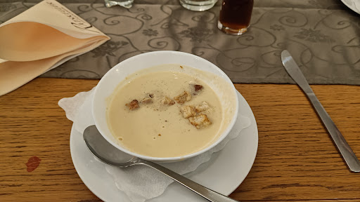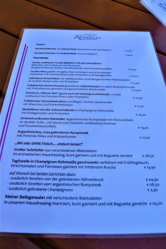 Read moreWir waren zu zweit ohne Reservierung an einem Dezember Wochenende 2022 im Ratskeller Veitshöchheim. Spontan, da wir hauptsächlich wegen dem schönen Weihnachtsmarkt an den Adventswochenenden dort waren. Nach dem Betreten des Restaurants wurde uns ein Tisch für 2 Stunden zugewiesen, da bereits alle Tische am Abend je nach Uhrzeit reserviert waren. 2 Stunden langten locker. Begrüßung sehr freundlich, kurzes Gespräch prima mit dem Personal. Sauberes Ambiente. 1 Kritikpunkt haben wir: Die Beleuchtung ist im gesamten Restaurant viel zu hell. Ein großer heller Saal. Trotz einer Deckenhöhe von ca. 4,50 Metern ist die Beleuchtung sehr hell. Das gefällt uns weniger gut. Gefallen hat uns jedoch die Vorspeise in Form einer Most-Sahne-Suppe mit (Zimt) - Croutons. Geschmacklich sehr gut abgestimmt, Portionsgröße gut gewählt. Auch ging es schön schnell von der Küche. Von der Bestellung bis zum Tisch vergingen bei der Suppe ca. 5 Minuten. Zwischen Suppe und Hauptmahlzeit vergingen 5 Minuten. Hier klappt also das Zeitmanagement zwischen Bedienung und Küche perfekt und das bei gut gefülltem Restaurant. Ich hatte einen Zwiebelrostbraten "Ratskeller Veitshöchheim", welcher perfekt war. Das Rumpsteak schöner Größe, dem passenden Gargrad, die geschmacklich leckeren Rosmarin Kartoffeln mit den Speck Bohnen auf einer tollen reduzierten Soße und röstzwiebeln. Die Partnerin hatte Lende vom Schwein mit einer Creme und Pilzen, dazu ein frischer Beilagen Salat. Mit Beilagen Änderungen wurde ohne Probleme umgegangen. Hier als Kritikpunkt wäre anzumerken, das Dressing vom Salat mit etwas mehr Mut zu Salz und Würze zuzubereiten. Das Dressing war schon recht wässrig. Toll wäre auch am Tisch einen Salz- und Pfefferstreuer während dem Essen zu stellen. Hätten wir aber auch sagen können. Portionsgröße bei beiden Hauptgerichten ausreichend für Erwachsene. Geschmacklich beide Gerichte sehr gut und hohe Qualität. Getränke frisch, sauberes Geschirr, sauberes Ambiente, eigens bedruckte Servietten in hoher Qualität. Vom betreten des Restaurants bis zum verlassen des Restaurants haben wir uns sehr wohl gefühlt. Preislich in den heutigen Zeiten vertretbar und moderat. Wir vergeben 4,5 von 5 Sternen. Wenn das Ambiente der Beleuchtung im Hauptrestaurant etwas gedimmter wäre, würde das dem gastraum sehr gut tun. Geparkt haben wir am Main an den Mainfrankensäälen. Toiletten kann ich nicht bewerten, habe ich diese nicht aufgesucht. Freundliches Personal, einheitliche schwarze Kleidung, kein Geruch der Kleidung nach dem Besuch im Restaurant. Wir kommen hierher gerne...