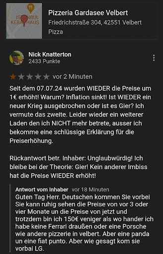 Leider gibt es keine Option zum Antworten! Nicht ich sollte ein bißchen netter mit den Leuten sprechen, sondern Sie, denn ich bin der Kunde. Und ich habe nett geredet, mit dem jungen Herrn, der geliefert hat, er bekam auch Trinkgeld, wie es sich gehört, genauso wie mit Ihrem Mitarbeiter am Telefon, mit dem ich auch sehr nett gesprochen habe. Schließlich kann keiner Ihrer Mitarbeiter etwas dafür, dass Sie als Chef Ihre Kunden verarschen, indem Sie 28 cm-Durchmesser- Pizzen verkaufen, die leider nur 26 cm Durchmesser haben... Und wenn ich als Kunde mit Ihnen als Chef am Telefon spreche, müssen SIE netter sein und mich wenigstens bis zum Ende anhören. Stattdessen fühlen Sie sich ertappt und fangen an mich anzuschreien, bevor ich meine Beschwerde zu Ende geführt habe.