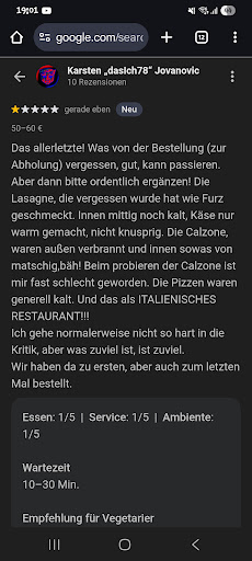 Heute Nachmittag haben wir einen Tisch mit 4 Personen für 19.30Uhr vorbestellt. Bei unserem pünktlichen Erscheinen wurden in unserem Beisein zwei 2 Personentische zusammen geschoben, wobei der eine ca. 5 cm höher war als der andere, der übernächste Tisch hätte die gleiche Höhe wie der erste gehabt. Der Nachbartisch wurde später besetzt und bekam sofort die Getränke serviert, die die Personen bei ihrer Ankunft bestellt hatten. Wir selbst sind bis dahin nicht nach Getränken gefragt worden, der Bedienung Nr. 2 hat uns die Speisenkarten in die Hand gedrückt (so wie gesagt) ohne eine Nachfrage nach Getränken. Bei unserer Bestellung haben wir Fleischgerichte bestellt mit der Nachfrage der täglichen Tagesbeilage, die uns als Kartoffeln mit Gemüse benannt wurde, die einzigste Alternative war Salat. Daher hat unser Sohn sich anstatt für das Rumpsteack für eine Pizza entschieden. Auf Grund der Aktivitäten des netten Kellners haben wir uns gegen eine Vorspeise entschieden und uns für einen Salat als Beilage entschieden. Das Wasser wurde uns mit erheblichen "Schlabbern" auf der Tischdecke serviert. Insgesamt war die Bedienung unfreundlich, die Pizza bei unserem Sohn ist beim Servieren fast vom Teller gerutscht. Das Fleischgericht war annehmbar, aber die Fleischstücke waren optische Reststücke, der Geschmack war ok aber optische Erscheinung und Größe nicht zufriedenstellend und für 22,90€ zu teuer. Fazit: die typisch italienischen Gerichte waren gut, die Bedienung (Kellner) auch die 2. Person, die ebenfalls uns bedient hatte, waren insgesamt eine Katastrophe. Diese hat bei einer Weihnachtsfeier vom Chef meines Sohnes ebenfalls ein katastrophales Handeln dargelegt. Nach weiteren Getränken und anderem wurden wir nicht gefragt. Gastronomie...