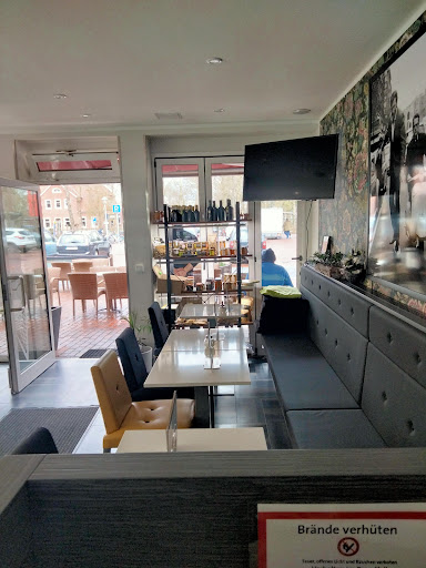 Man kann draußen sitzen, oder auch drinnen im modernen Ambiente.