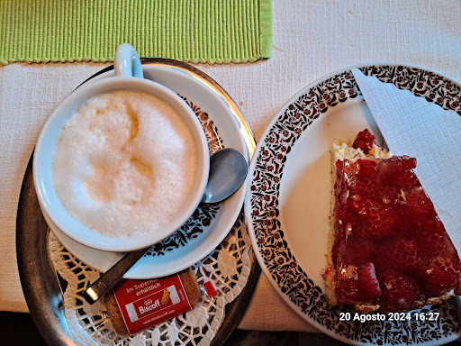 Zufällig entdeckten wir nach einem schönen Spaziergang zur Ave Maria-Kapelle und rund darum herum das Cafe Krapf mit seinem herrlichen Blumengarten. Das sah so einladend aus, dass wir kein Halten mehr kannten. Zufällig merkten wir auch, dass unser Kaffee- und Zuckerspiegel dringend nach oben korrigiert musste... und so kosteten wir uns in gemütlicher Atmosphäre drinnen im Haus (man kann auch unter Sonnenschirmen im Garten sitzen) happy - und ermuntert von der freundlichen Chefin mit: "Ihr könnt's euch doch leisten, so schlank wie ihr seid!" - durch herrliche Kuchen und Torten. Besonders die Schwarzwälder Kirsch und den Rhabarberkuchen mit Sahne fand ich genial. Insgesamt waren alle Kuchen frisch, nicht "von der Stange" und einfach nur köstlich. Klar, dass wir auch für zuhause noch zwei mitgenommen haben. Großes Lob und Dankeschön, dass unser Ausflug einen so tollen...