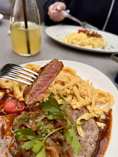 Dass hier Lebensmittel von hoher Qualität verwendet werden steht außer Frage. Nur wurden die Zwiebelrostbraten deutlich Durch gebraten, obwohl sie Medium bestellt wurden und Rosmarinkartoffeln als Beilage für drei Personen wurden in einer Schüssel serviert, was mengenmäßig klar zu wenig war. Zwar wurde angeboten, dass kostenfrei mehr serviert wird, aber die Nachbestellung kam erst an den Tisch als alle fertig waren mit dem Essen. Der Nachtisch konnte dann auch nicht ganz überzeugen, da hier mehr Sahne als Eis serviert wurde.