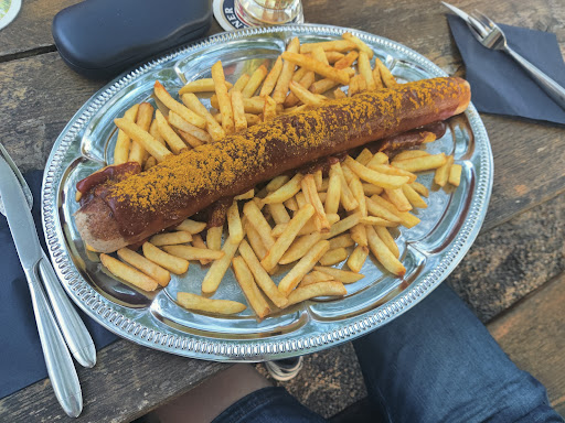 Zum Essen selbst: Am Anfang war ich kurz etwas stutzig über die Preise. Als ich die Portionen gesehen habe, die man serviert bekommt, fand ich diese jedoch absolut gerechtfertigt. Übermütig wie ich war, habe ich die große Currywurst Spezial bestellt und habe einen Unterarmlangen Giganten auf Pommes serviert bekommen. Das Essen hat super geschmeckt! Ein Freund nahm das Senner Schnitzel, dass eine kleine Besonderheit der Karte ist und auch das war sehr gut. Das wäre etwas was ich beim nächsten Mal auf jeden Fall probieren würde. Das einzige was von meiner Gruppe angemerkt wurde waren die Champignons. Die haben wohl etwas nach Dosen Champignons geschmeckt und frischere wären entsprechend für die Preise gut gewesen. Da mein Essen jedoch völlig ohne Manko war und ich das Lokal definitiv empfehlen kann, gibt es...