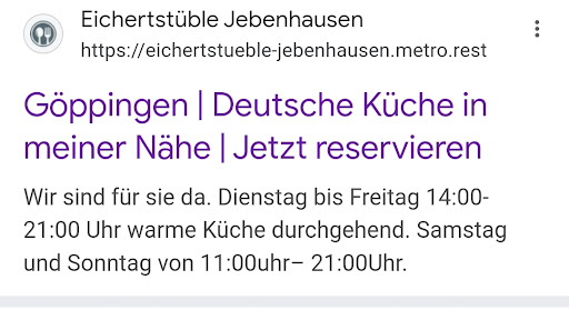 Keine Empfehlung! Wir (8 Radler aus Herrenberg) wollten heute um ca. 15 Uhr zum Essen im "Eichertsstüble" einkehren. Leider hatte daß Lokal entgegen der Angaben im Internet statt um 14 Uhr erst um 15 Uhr geöffnet. Warme Küche sollte es statt "durchgehend von 14-21 Uhr" erst ab 17 Uhr geben. Wir mussten uns deshalb in Jebenhausen eine andere Verpflegungsstelle suchen. Glücklicherweise hatte wenigstens die Bäckerei im Edeka geöffnet und die Metzgerei im Markt konnte uns ebenfalls mit herzhaften Speisen versorgen. Telefonisch war das Eichertsstüble die vergangenen Tage ebenfalls nicht erreichbar. Sehr enttäuschende Lokalität !! Zur Antwort ergänzend: Es ging ein Zettel an der Eingangstür: Mittwoch ab 15Uhr geöffnet. Wir waren definitiv um 15Uhr am Lokal ! Es saßen 3 Leute mit Getränken auf der Terrasse. Essen gab es keines !! Anrufbeantworter war nicht geschaltet oder erst nach 10x klingeln. Solange habe ich es nicht...