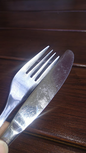 Wir mussten mehrfach Getränke zurückgehen lassen, da die Gläser nicht richtig gespült und oft mit Lippenstift verschmutzt waren. Das Besteck konnten wir uns glücklicherweise selbst aussuchen, da es ebenfalls schmutzig und schlecht gespült war.