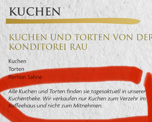 *edit: nach ihrer Antwort Selbst in der Mutter aller Kaffeehäuser, im alt ehrwürdigen Kaffehaus Sacher in Salzburg und Wien, kann man Kuchen zum Mitnehmen kaufen. Andere Kaffehäuser liefern sogar Torten und Kuchen außer Haus. Hätte ich damals schon gewusst, dass Sie ihre Torten nicht mal selbst herstellen, wäre uns der Weg erspart geblieben. Ich bin Stammkundin in Roßwälden und da ist der Service um Klassen besser! Und nein, wir wollten nicht aus Stress und Eile bei ihnen Kuchen kaufen, es war eine geplante Idee, weil wir uns für Sie interessiert haben. Und nein, wir haben keinen Frust, kennen viele andere Konditoren und Cafés und es war eine Leichtigkeit an diesem Tag, sehr freundlich, irgendwo anders einkaufen zu gehen. Kurios ist allerdings ihr Umgang. Es scheint ihnen schon eine gewisse Freude zu bereiten, Menschen, wegen ihres, nicht Mal selbst hergestellten Kuchens, auflaufen zu lassen. Das bleibt uns dann ab...