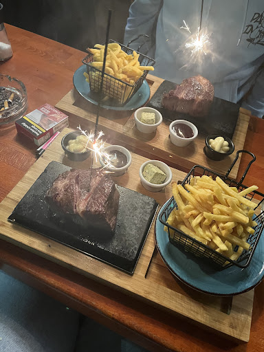 Die Location war zu dem Zeitpunkt in etwa zu 40% belegt. Die Getränke und das Essen wurden sehr zügig geliefert. Beeindruckend fanden wir, wie unser 6x bestelltes Hüft- und Rumpsteak an den Tisch gebracht wurde. Auf jedem Steak brannten Wunderkerzen und mehrere Crewmitglieder kamen an den Tisch. Das Steak, was eine weitere Sensation war, wurde auf einem heißen Stein serviert. Wodurch Jeder Gast, seine eigene Garstufe des Fleisches, wählen konnte. Fazination pur! Bestellt haben wir unser Steak mit Beilagensalat und Potatoes. Leider gab es KEINE Potatoes. Wir nahmen stattdessen die guten alten Pommes Frites. Enttäuscht waren wir deshalb nicht, zu groß war der WOU-Effekt dieser Speise.