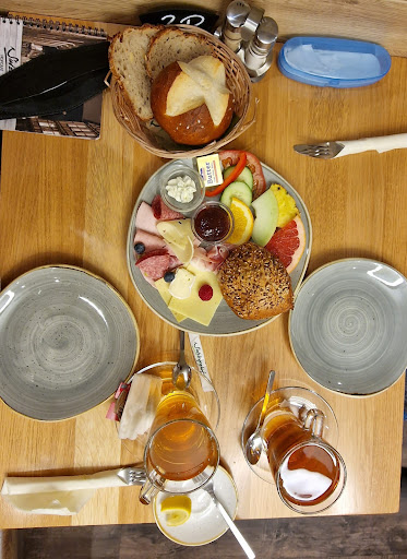 Das Café und das Ambiente ist an sich wirklich sehr schön, das Brot sehr lecker und auch die große Auswahl an der Theke ist super. Doch was wirklich zu wünschen übrig ist, ist die Freundlichkeit und Service des Personals. Wir hatten auf 11 Uhr einen Tisch reserviert gehabt für 7 Personen und waren pünktlich dort. Nach einer halben Stunde Wartezeit wurden wir nicht einmal bedient, obwohl das Cafè nicht sonderlich voll war. Nach über einer halben Stunde habe ich dann einen Bediener gerufen, der nur Getränke aufgenommen hatte, obwohl wir gesagt haben wir wollen gleich Essen mit bestellen, er meinte es wäre nicht möglich und würde erst mal nur Getränke aufnehmen. Nach weiteren 20 Minuten kam immer noch niemand zum Essen bestellen, nachdem ich dann eine junge Dame darauf aufmerksam gemacht habe, dass wir schön fast 50 Minuten warten um zu bestellen, sagte sie nur pampig es wären noch andere Gäste hier und wir nicht die einzigen im Laden die bedient werden müssen, obwohl alle anderen Gäste ihr Essen schon hatten oder ihre Bestellung aufgegeben gehabt hatten. Nach fast 50min wurden wir dann richtig bedient. Dass Essen kam danach sehr schnell, das Frühstück war zwar gut, doch viel zu wenig Aufstrich für zwei Personen (eine kleine Mini-Schüssel Frischkäse und zwei kleine Butter für 2 Personen und so viel Aufschnitt. Wir haben eine Flasche Rosèwein bestellt, und keiner der Bediener wussten den Preis dafür. Die Flasche war dann auf der Rechnung mit 20€ Euro versehen, wohl gemerkt wäre die Flasche fast ein Glas teurer als 3 Gläser mit dem selben Inhalt(???) nach erneutem Nachfragen des Preises, weil wir noch eine weitere Flasche bestellen wollten, wurde die zweite aufs Haus geschenkt (da frage ich mich natürlich, ob sie uns abziehen wollten, da die Flasche ja eigentlich viel teurer war als wir oben erwähnt 3 Gläser des selben Inhalts.) Nach dem wir gefrühstückt hatten, wollten wir noch einen Stück Kuchen an der Theke mitnehmen, vorne waren 5 Bedienerin, die sich lieber untereinander unterhielten als die Kunden zu bedienen. Also auf Grund des schlechten Service und des sehr unfreundlichen Personals, werden wir nicht mehr dort essen gehen, sehr sehr schade, unser letzter Besuch dort. Sowas geht gar nicht! Meine Freunde und ich waren wirklich geschockt darüber, wie man dort mit uns umgegangen ist und wie unfreundlich das Personal war. Wenn man keine Lust auf Kunden hat, sollte man den Service sein lassen! Für den Preis, kann man auch wo anders viel besser...